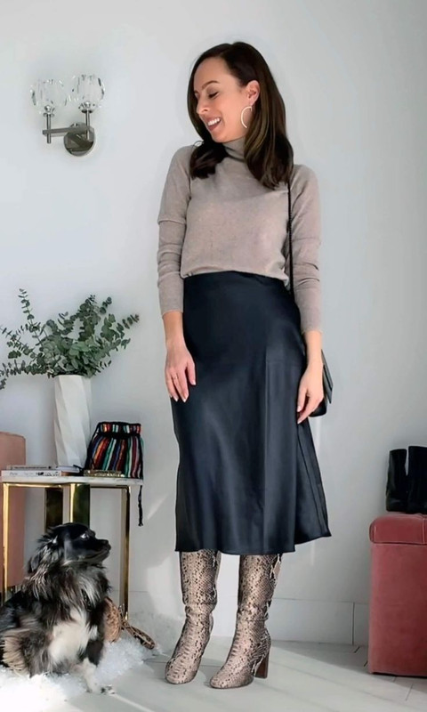 Don't forget to combine your boots with skirts and dresses. In the cold, I like to wear a silky midi skirt or midi sweater dress with a boot. Finish with a comfortable cropped coat. When deciding how to wear dresses in the cold, remember to layer up to be warm. The nice thing about this style is that you can add leggings beneath to stay warm if it's really chilly outside.